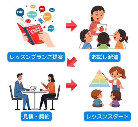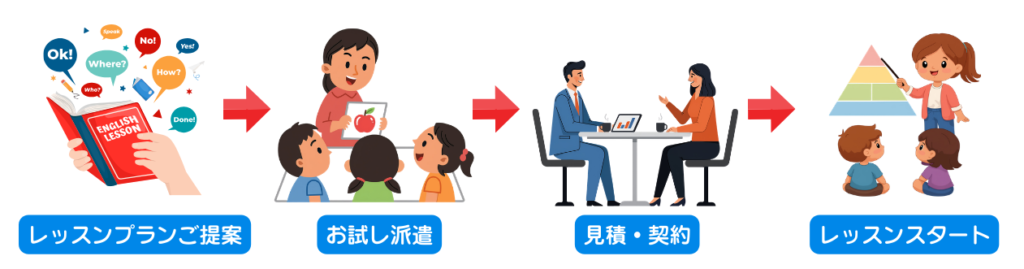 課内での英語レッスン導入、そして課外での英語教室開校、どちらでも園様のご都合に合わせてご検討いただきたくご案内申し上げます。